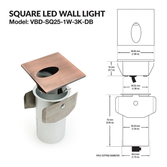 VBD-SQ25-1W-3K-DB Square Dimmable LED Step Light/ Pathway Light, 12V 1W 3000K(Warm White)