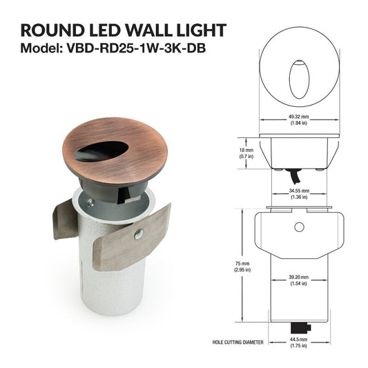 VBD-RD25-1W-3K-DB Round Dimmable LED Step Light/ Pathway Light, 12V 1W 3000K(Warm White)