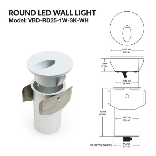 VBD-RD25-1W-3K-WH Round Dimmable LED Step Light/ Pathway Light, 12V 1W 3000K(Warm White)