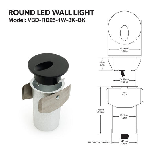 VBD-RD25-1W-3K-BK Round Dimmable LED Step Light/ Pathway Light, 12V 1W 3000K(Warm White)