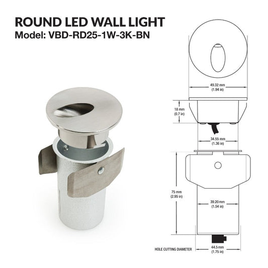VBD-RD25-1W-3K-BN Round Dimmable LED Step Light/ Pathway Light, 12V 1W 3000K(Warm White)