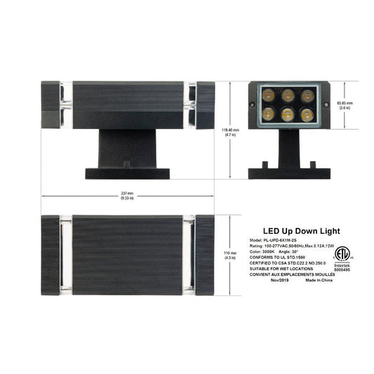 PL-UPD-6X1M-2S LED Wall Light Up Down Wall Light, 100-277V 12W 3000K(Warm White)
